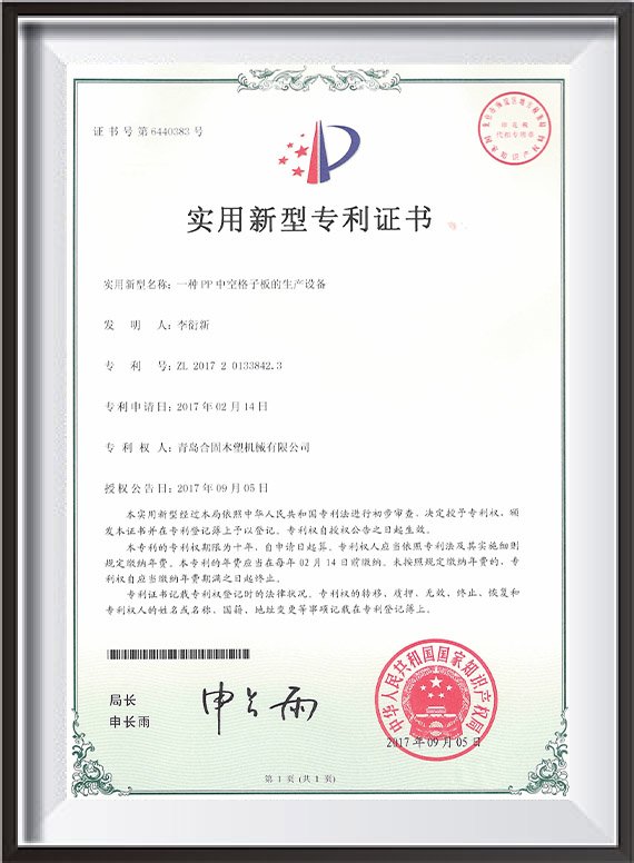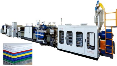 This production line realizes continuous production of PC/PE/PP hollow grid plate, which is applicable to construction decoration, advertisement collocation, and noise insulation of highway as well as packaging. PE/PP hollow grid plate is an ideal substitute for paper box in making packaging box. It is characterized by light weight, high intensity, dampproof, and anticorrosion. The width of the products is 1220-2100mm, and the thickness is 2mm-12mm.