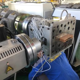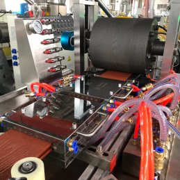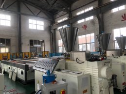PP PE WPC wood plastic composite WPC profile extrusion line for making outdoor WPC decking, fence, post, pallet, flooring, chair, wall panel etc.The extrusion line includes conical twin screw extruder, calibration platform, hauling off and cutting machine with dust suction device, product stacker. Through mixing, granulating, extruding, embossing, sanding, brushing etc processing, the PE WPC profile can be similar with natural wood in appearance and feel.