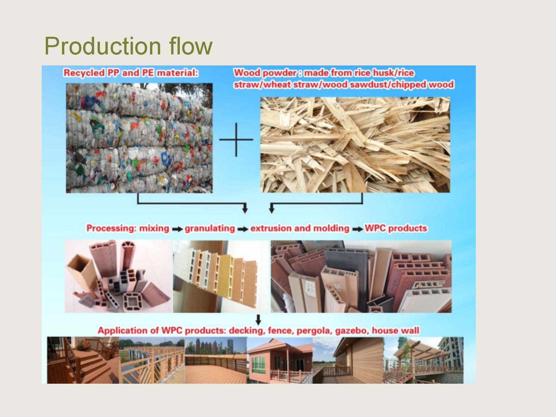 Tongsan Wood Plastic WPC machine is developed for using recycled PP/PE plastic mixing with agriculture wastage(such as wood sawdust, rice husk, rice straw, wheat straw) to make eco-friendly construction products, the max. wood percentage can be 70%.