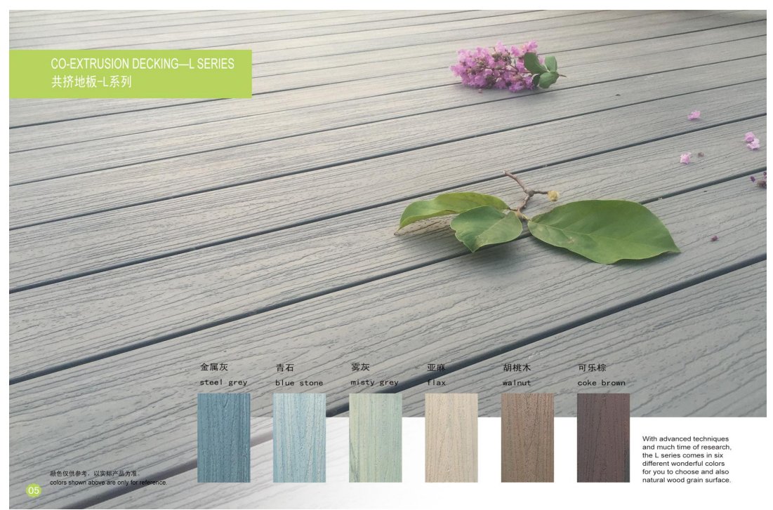 Our company provides high-quality wood-plastic profile extrusion lines and mature co-extrusion material formulations and co-extrusion technology. Commonly used co-extrusion materials include four kinds of materials: natural color co-extrusion material, UV masterbatch, basic color masterbatch and wood grain masterbatch.